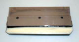 枠内に印刷インク(1版に対して1色)を入れ、スキージ(左側写真)と呼ばれるヘラ状のゴム板でスクリーンの内面を加圧しながら移動させます
