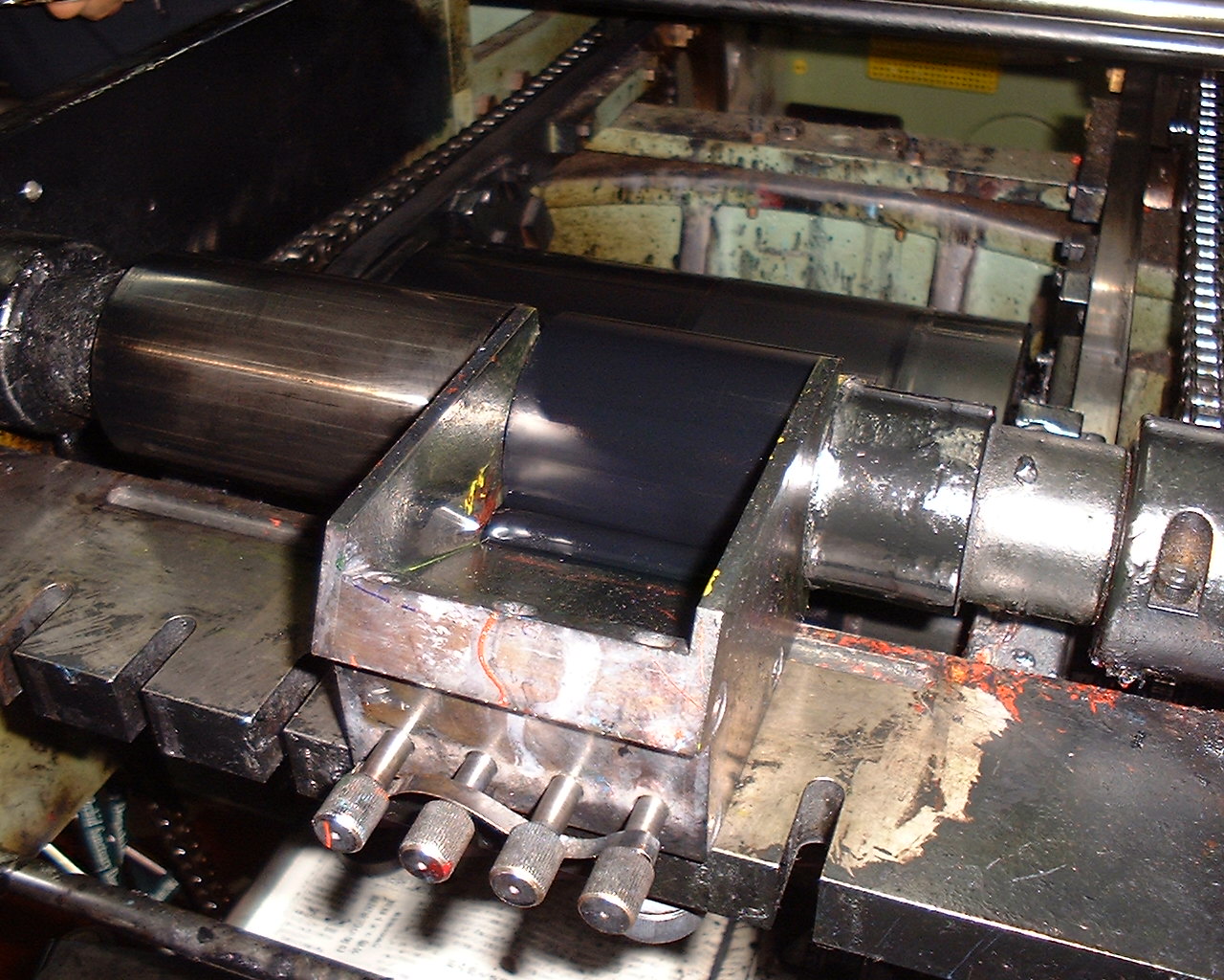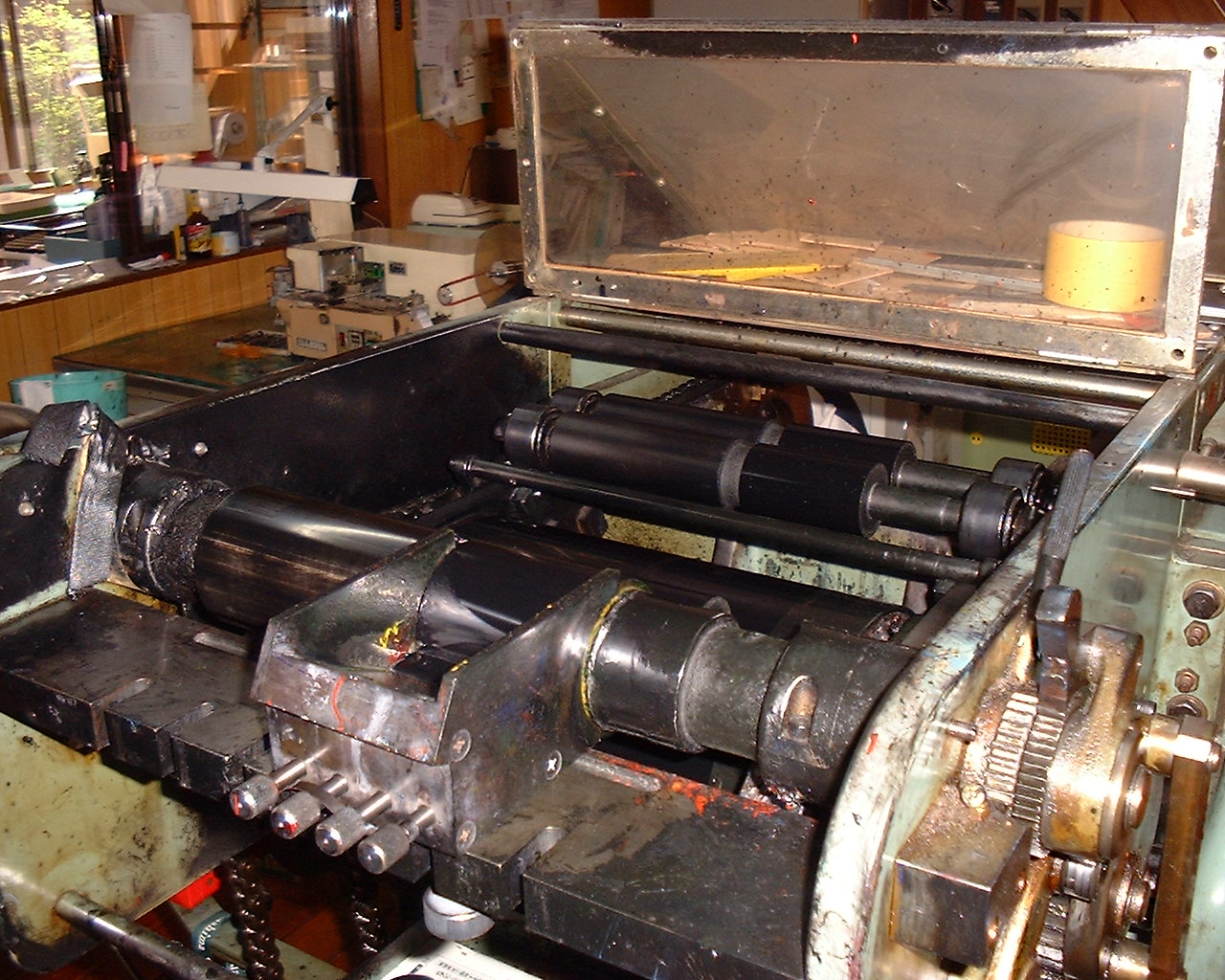 インク受けの奥にあるローラーがインクローラーです。 インク受けから2つのローラーを経てインクローラーにインクが付きます。 インクローラーが回転して手順(1)の凸版(樹脂版)にインクが移ります。