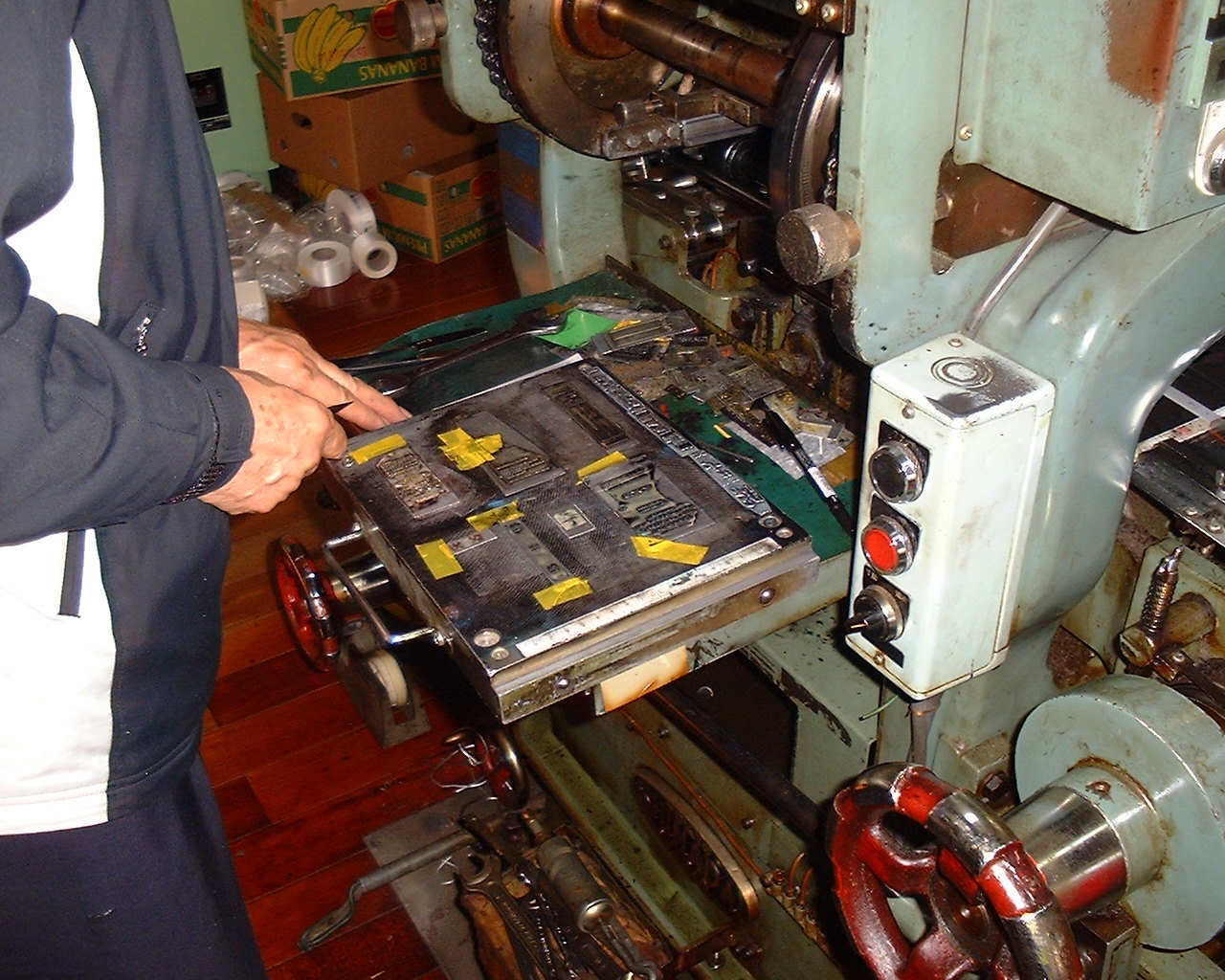素材(テープ)を上に持ち上げることによって、その上にある凸版に押し付けます。 凸版に付いているインクが素材(テープ)に印刷されます。