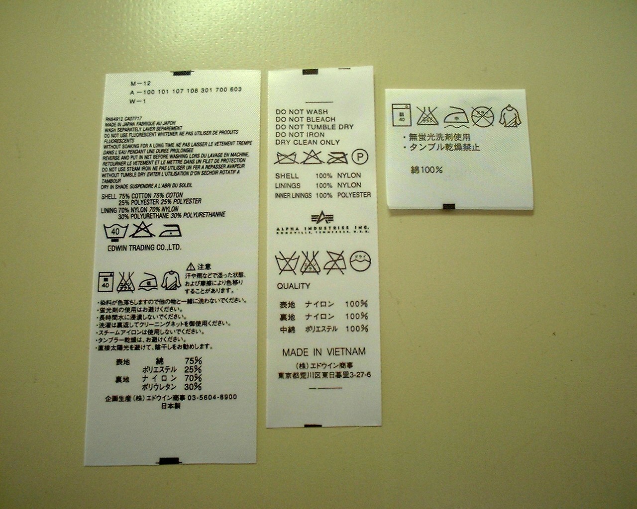 衣料を洗濯したりアイロンを掛けたりする時の、取扱い方法や注意を促します。素材の品質も同時に表示するのが一般的です。